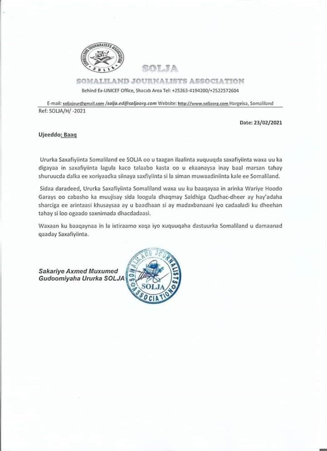Talaado, Febraayo, 23, 2021 (HOL)- warsaxafadeed uu soo saaray ururka suxufiyiinta Somaliland ee SOLJA, ayaa hayadaha cadaalada ee Somaliland ugu baaqay in ay baadhaan, arinka saxafiyad Hoodo Garays iyo Booliska Somaliland.