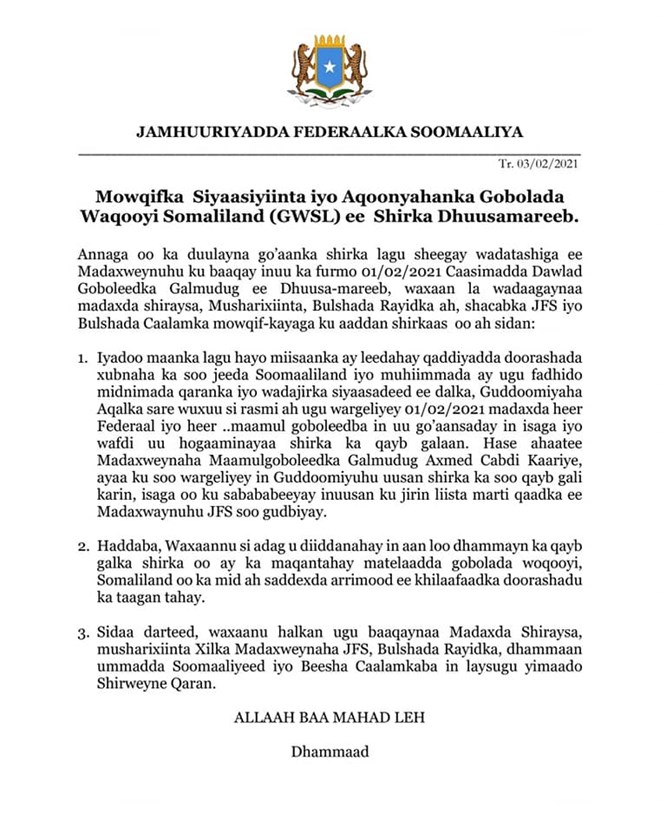Waxay sidoo kale sheegeen in shirka Dhuusamareeb aanan lagu casuumin guddoomiyaha Aqalka Sarre ee dalka Cabdi Xaanshi Cabdullaahi kaaso aay sheegeen inuu horay u dalbaday ka qeybgalka Shirka hayeeshee aanan looga soo jawaabin.