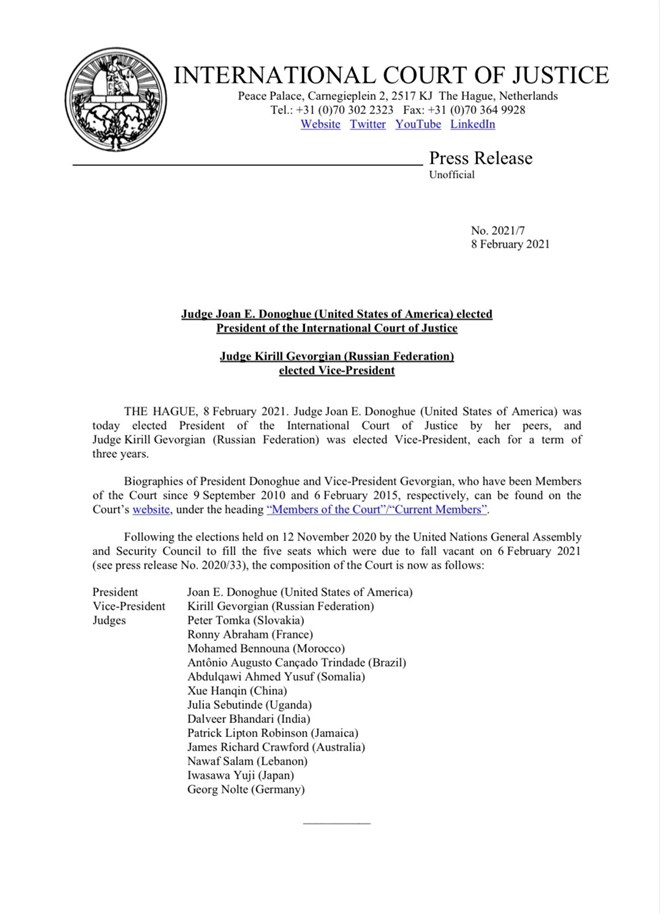 Garsoore Kirill Gevorgian oo kasoo jeeda dalka Ruushka ayaa isagana loo doortay Madaxweyne ku xigeenka maxkamada ICJ, mid walbana waxaa loo doortay saddex sano inuu xafiiska joogo..