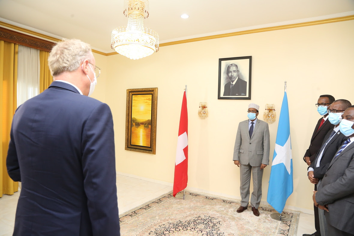 Sido kale, Danjiraha dalka Switzerland Mudane Valentin Zellweger ayaa u gudbiyey Madaxweynaha dhambaal iyo salaan uu uga siday dhiggiisa dalkaas Mudane Guy Parmelin, oo ku saabsanaa in dalkaasi uu saaxiib dhaw la yahay shacabka Soomaaliyeed, xiriir soo jireen ahna uu kala dhexeeyo.