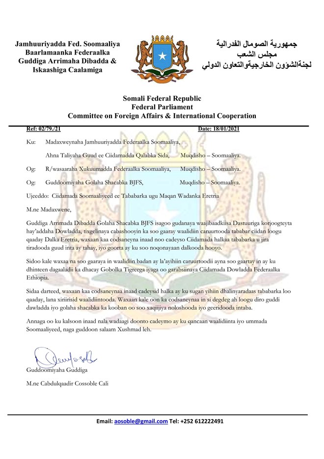 Arbaco, Janaayo, 20, 2021 (HOL) - Guddiga Arrimada Dibadda Golaha Baarlamaanka Soomaaliya ayaa qoraal ku saabsan ciidamadii tababarka loo geeyay dalka Eritrea waxaa ay u gudbiyeen madaxweynaha Soomaaliya, Maxamed Cabdullaahi Farmaajo.