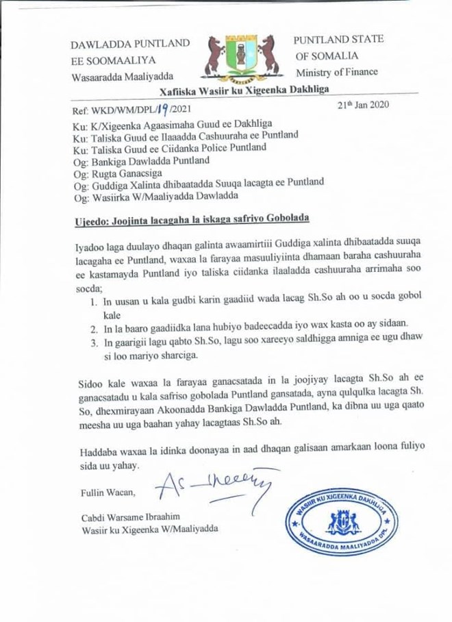 newsinsideGo’aankaan waxaa soo saartay wasaaradda maaliyadda Puntland oo fulinaysa go’aamadii xalka looga gaarayay dhibaatada lacagta shilin Soomaaliga, waxaana ganacsatada lagu amray in lacagahooda ku xareeyaan bangiyada.