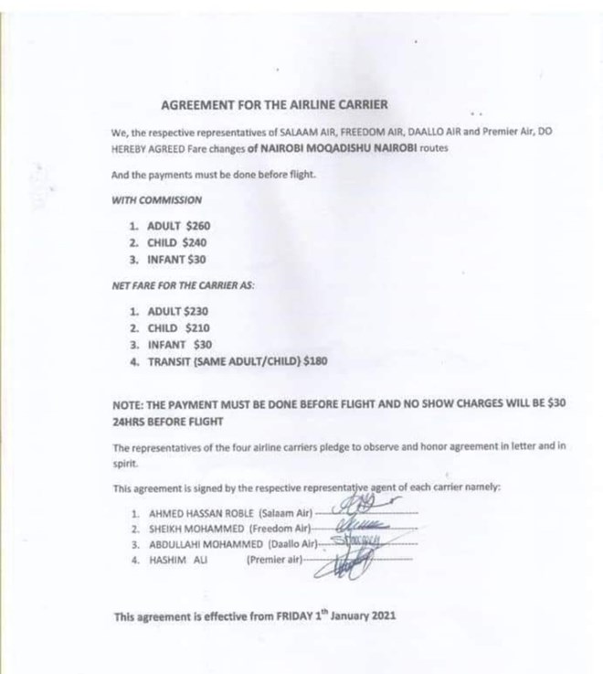newsinsideHeshiis ay wada galeen afar shirkaddood oo duulimaad ayaa lagu sheegay in qiimaha laga dhigay $260 oo laga qaadayo dad u safraya Muqdisho iyo Nairobi.
