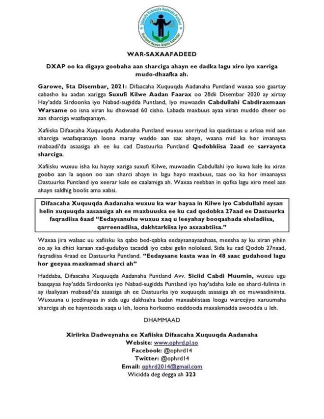 Dhinaca kale, xafiiska difaaca xuquuqda Aadanaha ayaa walaac xoogan ka muujiyay Xaaladda Badqab ee Wariye Kilwe Aadan Faarax iyo qof kale oo rayid ah, kuwaas oo xarrigooda xafiisku ku tilmaamay mid sharci darro.
