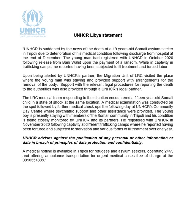 Khamiis, Janaayo, 07 2021 (HOL) - Hay’adda UNHCR ayaa sheegtay in ay ka murugaysan tahay geerida 19-jir magangalyo-doon Soomaali ah oo ku sugnaa magaalada Tripoli ee dalka Libya ka dib markii laga soo saaray cusbitaalka dhammaadkii Diseembar.