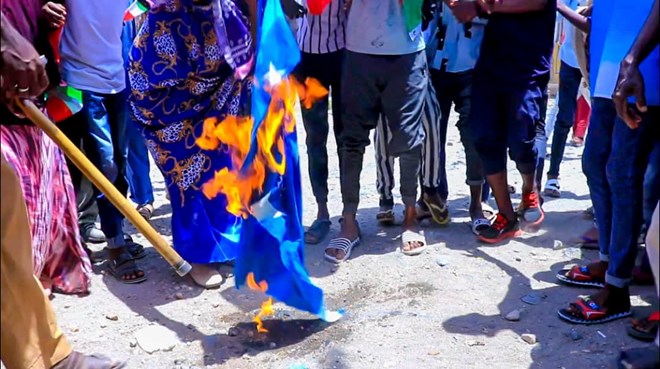 Isla saakana koox dhalinyaro ah ayaa calanka buluuga ah ee Soomaaliya ku gubay gudaha Borama.