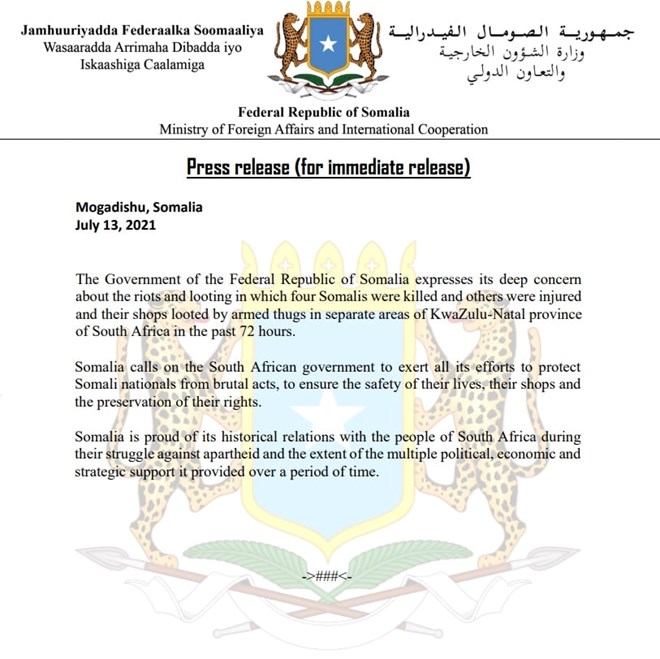 "Jamhuuriyadda Federaalka Soomaaliya waxay muujineysaa walaaceeda kaga aadan rabshadihii iyo bililiqadii ay ku dhinteen afar qof oo Soomaali ah kuwo kalena ay ku dhaawacmeen, islamarkaana goobahooda ganacsi ay dhac ka geysteen tuugo hubaysan meelo kala duwan oo ka tirsan gobolka KwaZulu-Natal ee Koonfur Afrika 72-dii saacadood ee la soo dhaafay " ayaa lagu yiri qoraalka kasoo baxay dowladda Soomaliya.