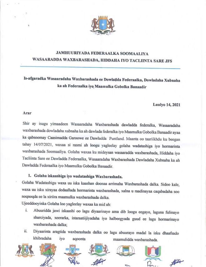 Madaxda ku shirtay Puntland, Caasimadda Garoowe ayaa soo saaray Warsaxaafeded ay uga hadlayaan waxyaabahii la iskula soo qaaday shirka.
