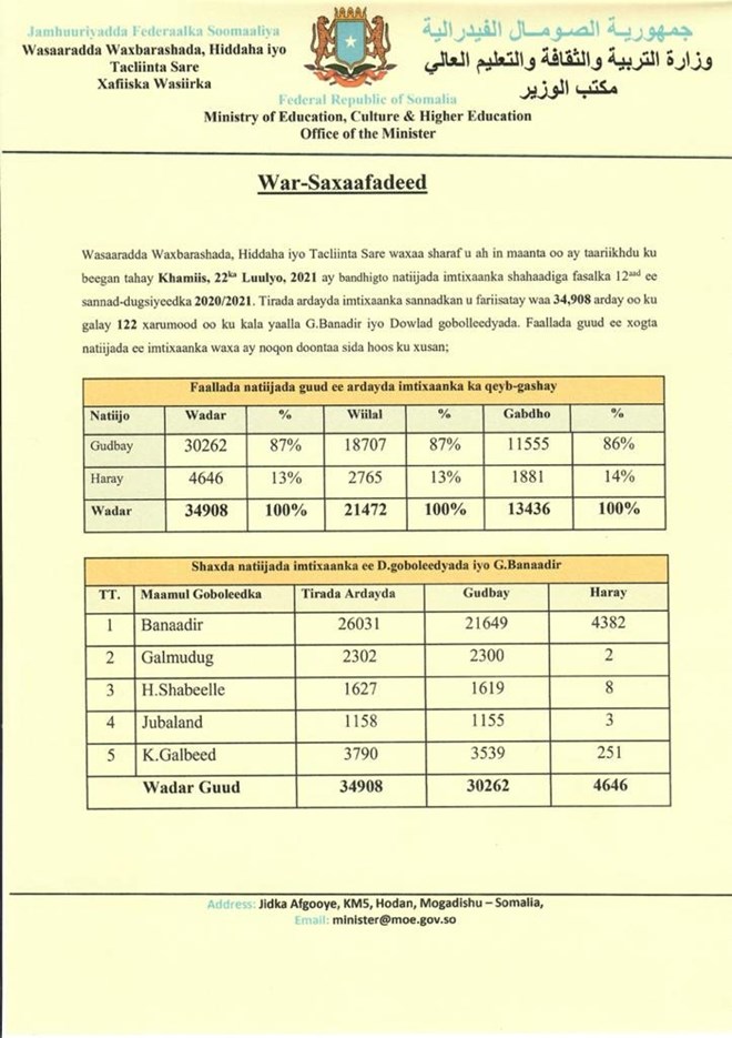 Khamiis, Luulyo, 22, 2021 (HOL) - Wasaaradda waxbarashada dowladda federalka Soomaaliya ayaa goor dhowayd shaacisay natiijada imtixaankii shahaadiga fasalka 12-aad sanad dugsiyeedka 2020/2021.