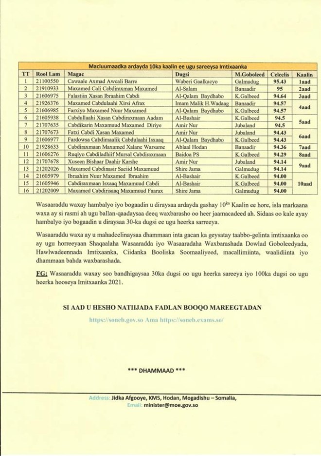 newsinsideWasaaradda waxbarashadu waxay soo bandhigtay tobankii arday ee ugu sareeyay natiijada imtixaanka, waxaana kaalinta koowaad u galay, Cawaale Axmed Aw-cali oo ka socday dugsiga sare ee Waaberi ee magaalada Gaalkacyo