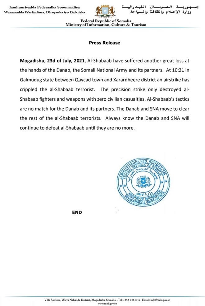 Jimco, Luulyo, 23, 2021 (HOL) - Dowladda Soomaaliya ayaa sheegtay in Al-Shabaab ay la kulantay khasaare kale oo weyn, kaddib markii duqeyn xagga cirka ah ay ku garaacday dagaalamayaal ku sugnaa inta u dhexeeysa Qaycad iyo Xarardheere ee gobolka Mudug.