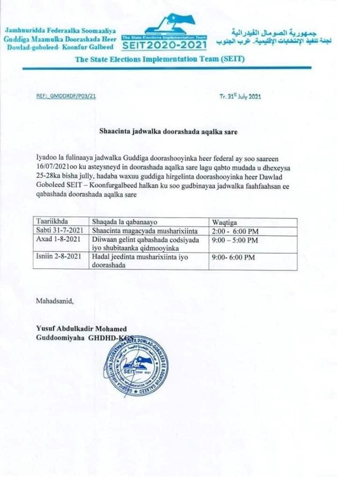 Doorashada Shantan kursi ee ka mid ah kuraasta Aqalka Sare ee deegaan doorashadoodu tahay Koofur Galbeed ayaa lagu wadaa iney qabsoonto maalinta Isniinta ah oo ay taariiqda ku beegan tahay 02-08-2021.