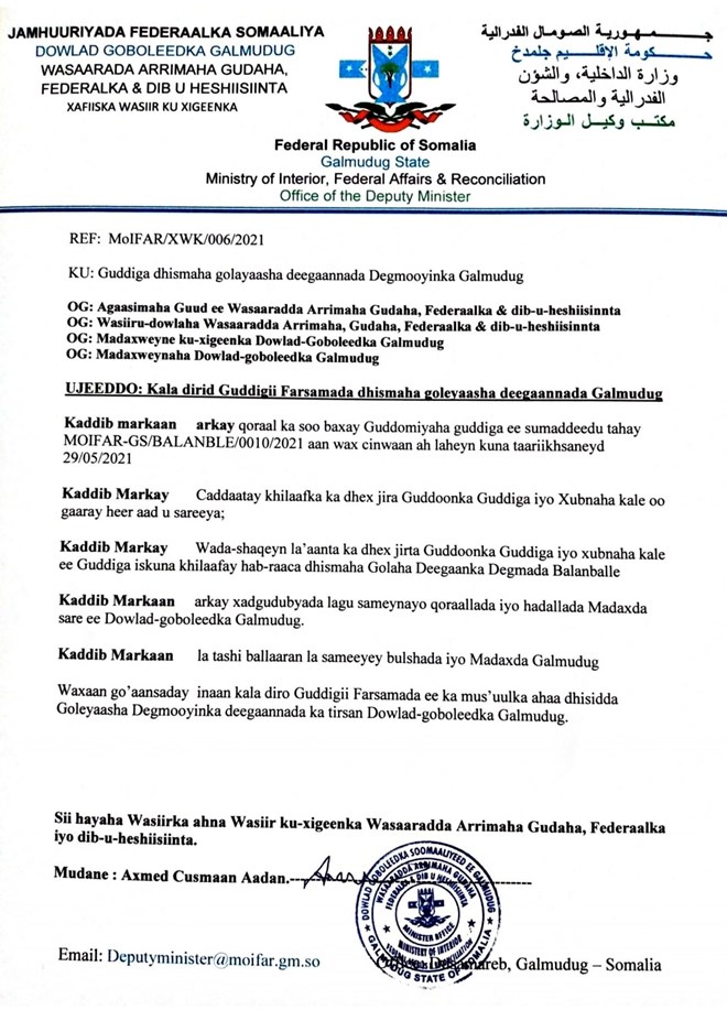 Talaado, Jun, 1, 2021 (HOL) - Wareegto kasoo baxday xafiiska wasiir ku xigeenka wasaaradda arrimaha gudaha maamul goboleedka Galmudug Axmed Cismaan Aadan ayaa lagu sheegay in la kala diray guddigii farsamada ee dhismaha golayaasha deegaanada Galmudug.