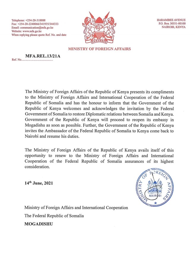 Isniin, Juun, 14, 2021 (HOL) - Kenya iyo Soomaaliya waxay dib ugu soo laabteen dhabbihii dib loogu soo celin lahaa xiriirkii diblomaasiyadeed ka dib khilaaf daba dheeraaday oo labada dal ka dhaxeeyay tan iyo sanadkii hore.