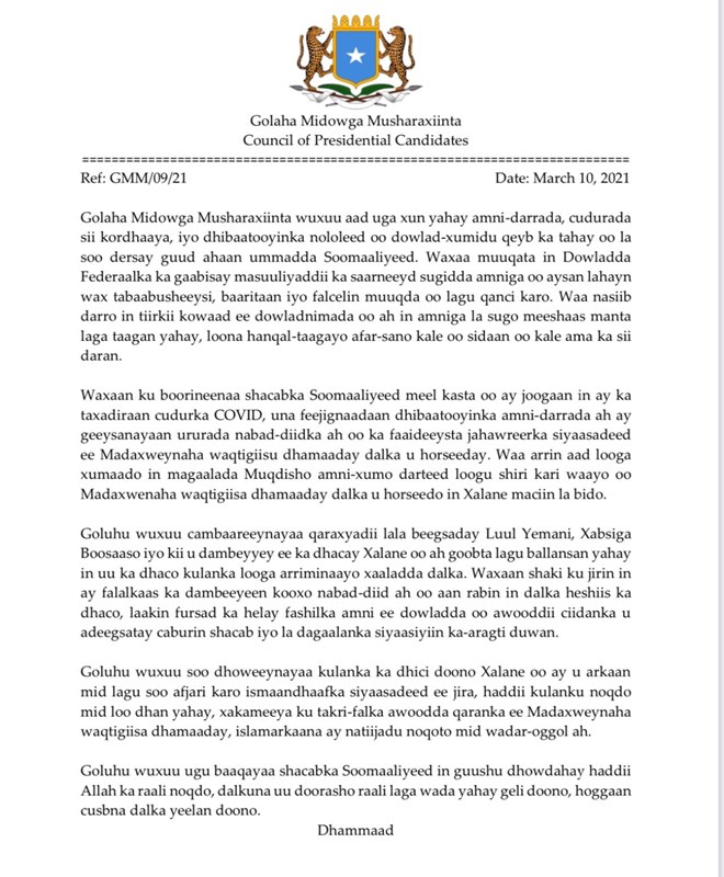 Arbaco, Maarso, 10, 2021 (HOL) - Golaha midowga musharrixiinta madaxweynaha Soomaaliya, ayaa walaac xooggan ka muujiyay amni darrada iyo faafitaanka cudurka Covid-19, iyagoo dowladda ku eedeeyay in ay ka gaabisay masuuliyaddii ka saarnayd arrimahan.