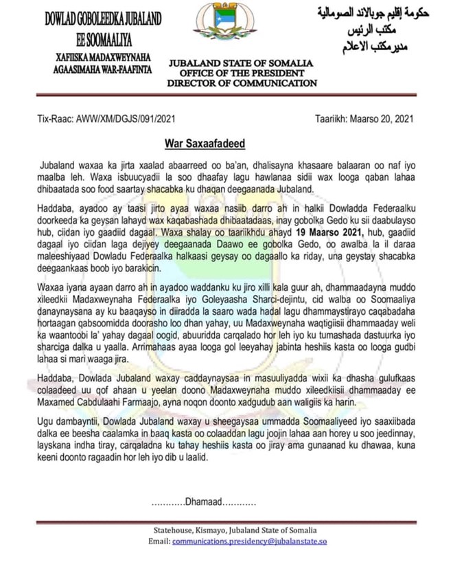 Halkaan hoose ka aqriso qoraalka kasoo baxay madaxtooyada Jubbaland:-