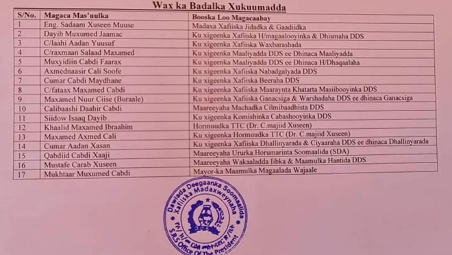 Sabti, Maarso, 06, 2021 (HOL) - Wareegto cusub oo saaka kasoo baxday Xafiiska Madaxwaynaha DDS ayaa lagu magacaabay ku xigeenno cusub, maareeyayaal iyo madax xafiiseedyo.