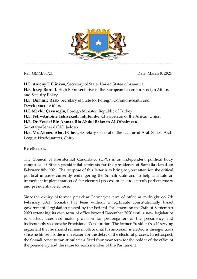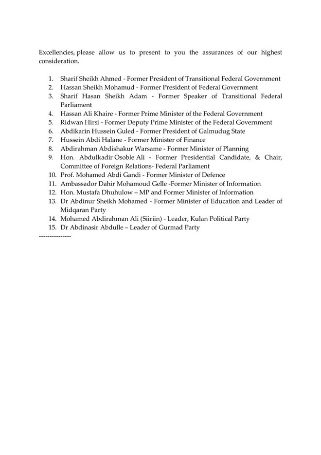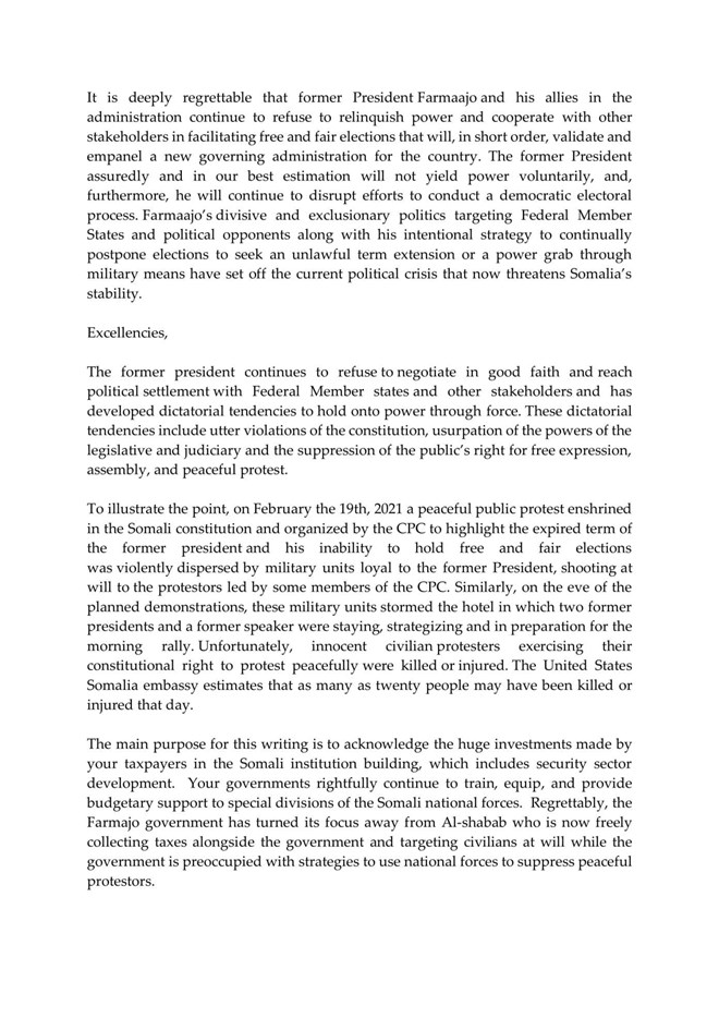 Waxey sheegeen in ficallada Farmaajo ay halis galinayaan xasiloonida Soomaaliya, islmarkaana uu weli diidan yahay in uu si daacad ah ula xaajoodo madaxda maamul goboleedyada Soomaaliya, sida qoraalka loo dhigay