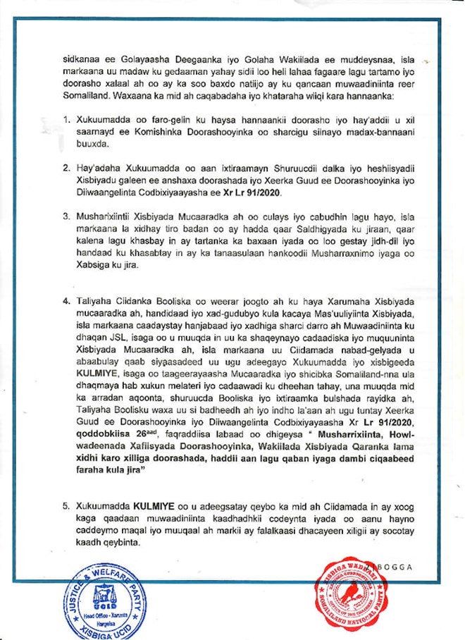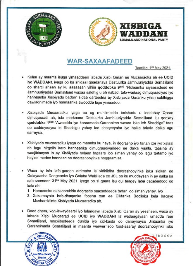 newsinsideWarmurtiyeedka ayaa lagu yidhi “Dood dheer iyo is xogwaydaarsi kadib labada xisbi qaran waxay la wadagaayaaan umada Somaliland, saaxibada caalamka iyo cidkasta oo danaynaysa dimuquraadiyada Somaliland in war war soo food saray doorashadii”
