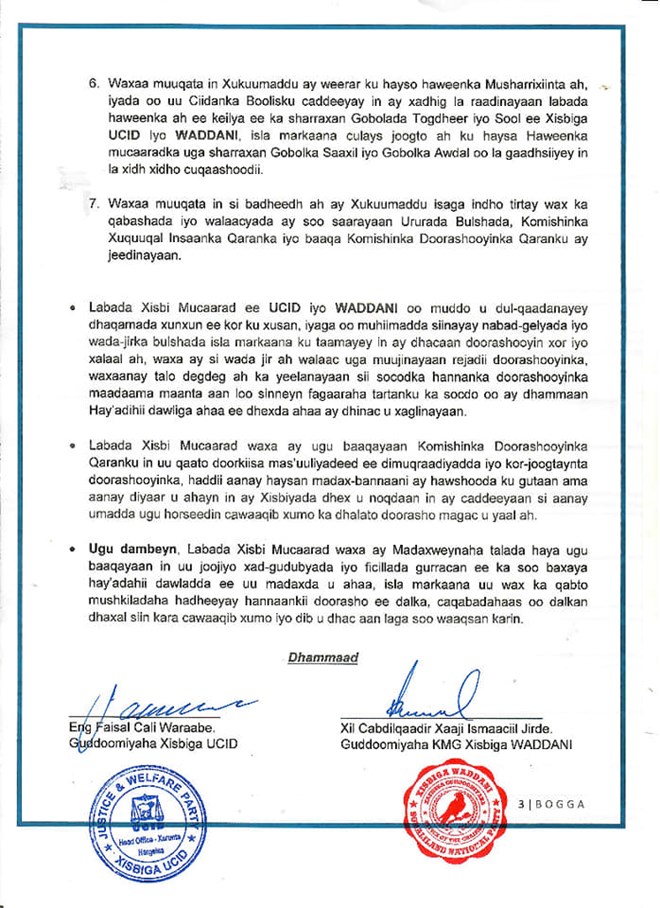 Warmurtiyeedka ay soo saareen labada xisbi mucaarad ayaa u dhignaa sidan:-