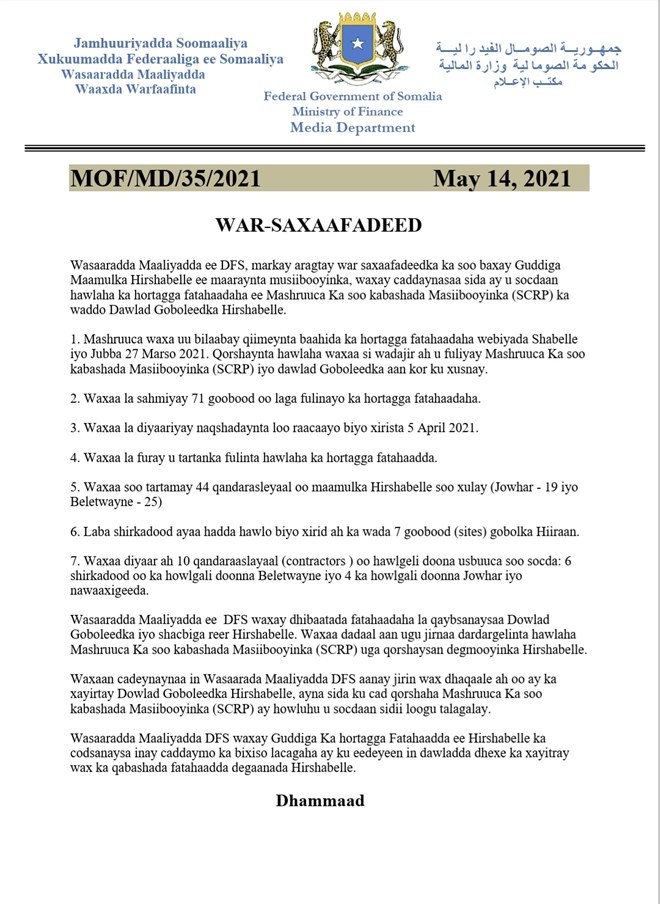 Jimco, May, 14, 2021 (HOL) - Wasaaradda maaliyadda Soomaaliya ayaa jawaab ka bixisay eedayn kasoo yeertay guddiga fatahaada Hirshabeele oo ku eedeeyay wasaaradda maaliyadda in ay xayirtay dhaqaalihii loogu talo galay ka hortagga iyo maaraynta fatahaada webiga Shabeelle.