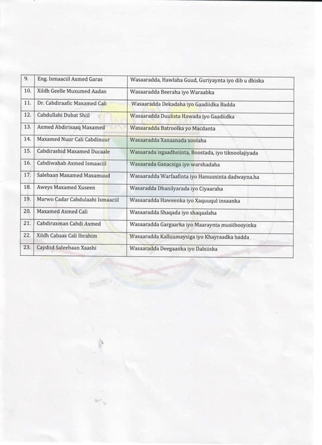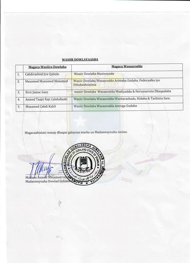 Arbaco, May, 19, 2021 (HOL) - Madaxweynaha Jubbaland, Axmed Madoobe ayaa muddo 2 sano ku dhow kadib magacaabay golihiisa wasiiradda oo ka kooban 50 xubnood oo isugu jira 23 wasiir, 22 Wasiir ku xigeen iyo 5 wasiiru udowle.