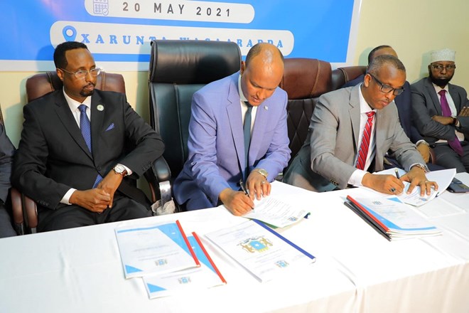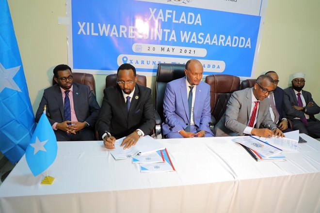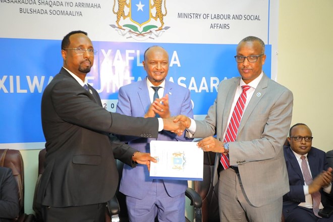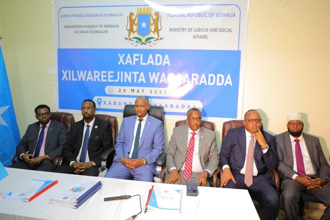 Khamiis, May, 20, 2021 (HOL) - Wasiirka cusub ee Wasaaradda Shaqada iyo Arrimaha Bulshada Xukuumadda Federaalka Soomaaliya, Mudane Cabdiwahaab Ugaas Khaliif Ugaas Xuseen ayaa maanta si rasmi ah xilka ugala wareegay wasiirkii hore ee Wasaaradda , Duraan Axmed Faarax , ka dib munaasabad ka dhacday xarunta Wasaaradda oo uu goobjoog u ahaa Ra’iisul Wasaare Ku-xigeenka Xukuumadda , Mahdi Maxamed Guuleed.