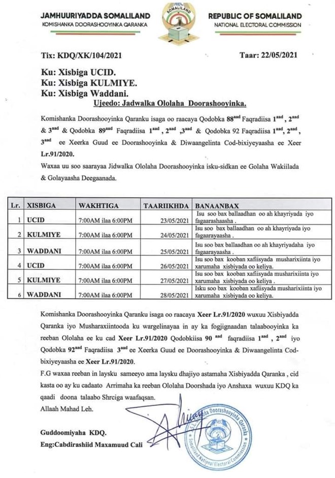 Jimco, May, 21, 2021 (HOL) - Koomiishanka doorashooyinka Somaliland, ayaa go’aamiyay in ollolaha doorashooyinka isku sidkan ee barlamaanka iyo deeganku socdo muddo ku siman 6 cisho, oo ka bilaabanta 23 May kuna dhamaata 28 May, iyadoo xisbi walba 2 maal mood lasiyay.