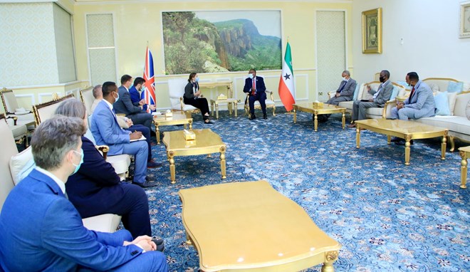 Isniin, May, 3, 2021 (HOL) - Madaxweynaha Somaliland Muuse Biixi Cabdi, ayaa xafiiskiisa ku qaabilay safiirka Ingriiska ee Soomaaliya amb. Kate Foster oo uu weliyo madaxa xafiiska Ingriiska ee Somaliland Stuart Brown.
