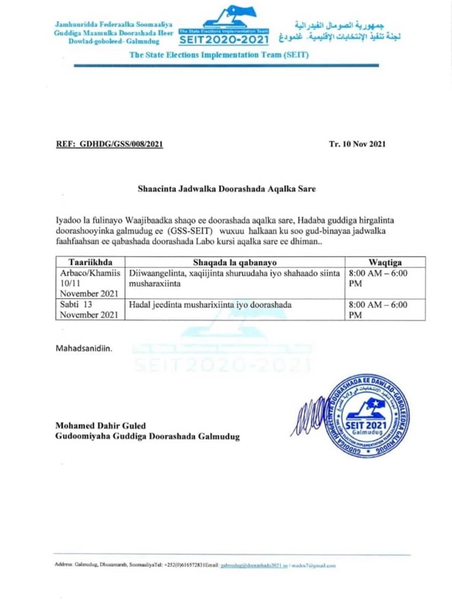 newsinsideWar qoraal ah oo kasoo baxay guddiga hirgelinta doorashada maamulka Galmudug ayaa lagu sheegay in maanta oo Arbaco ah ay bilaabaneyso diiwan gelinta, xaqiijinta iyo Shahaado siinta Musharaxiinta, islamarkaana maalinta Sabtiga ee oo taariiqda ku beegan tahay 13-11-2021 la qaban doono doorashada labada Kursi.
