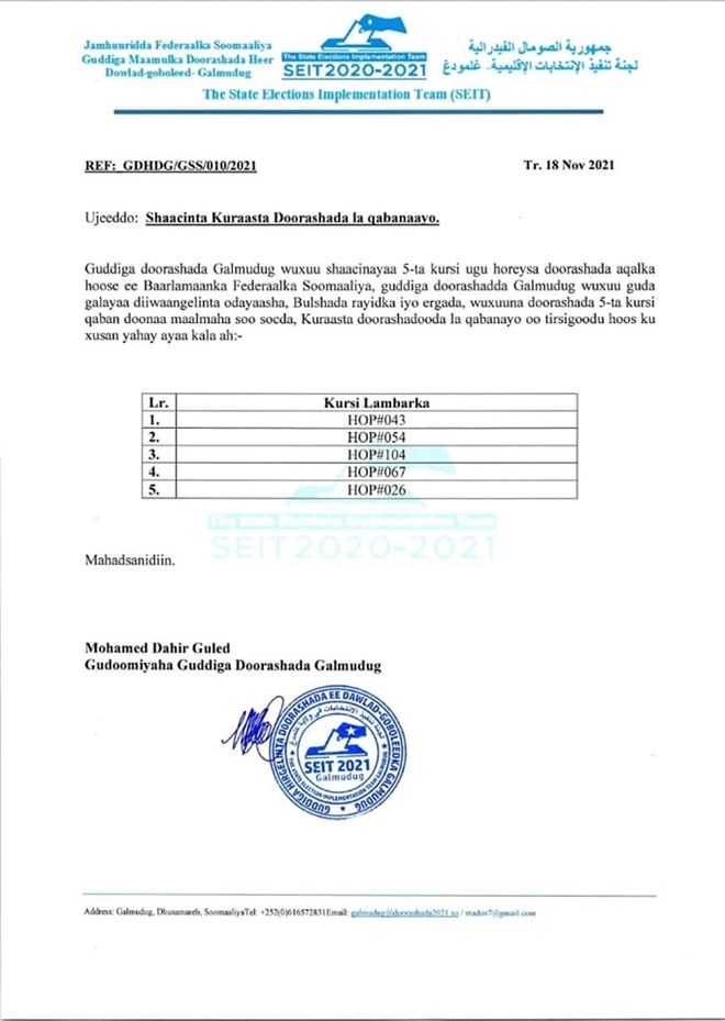 Khamiis, November 18, 2021 (HOL) - Guddiga Hirgelinta Doorashada maamulka Galmudug ayaa shaaciyay shanta kursi ee ugu horeysa ee la qabanaayo doorashadooda maalmaha soo socda.