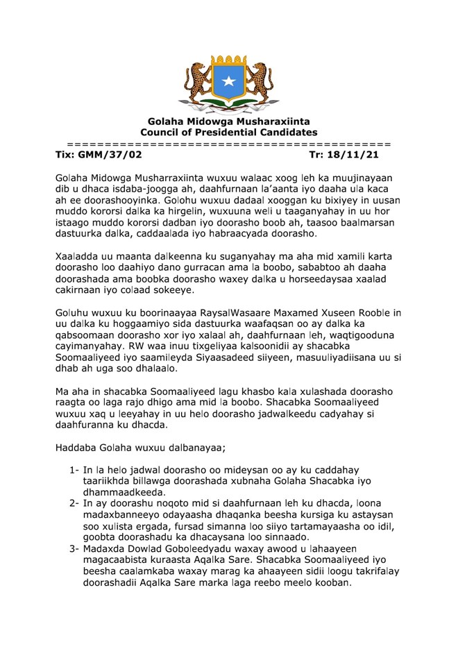 Khamiis, November 18, 2021 (HOL) - Golaha midowga musharraxiinta madaxweynaha Soomaaliya, ayaa qoraal ay soo saareen waxay kaga digeen cawaaqib xumada ka dhalan karta boob lagula kaco doorashada aqalka hoose, taasoo ay sheegeen in ay ka dhalan karto colaad sokeeye.