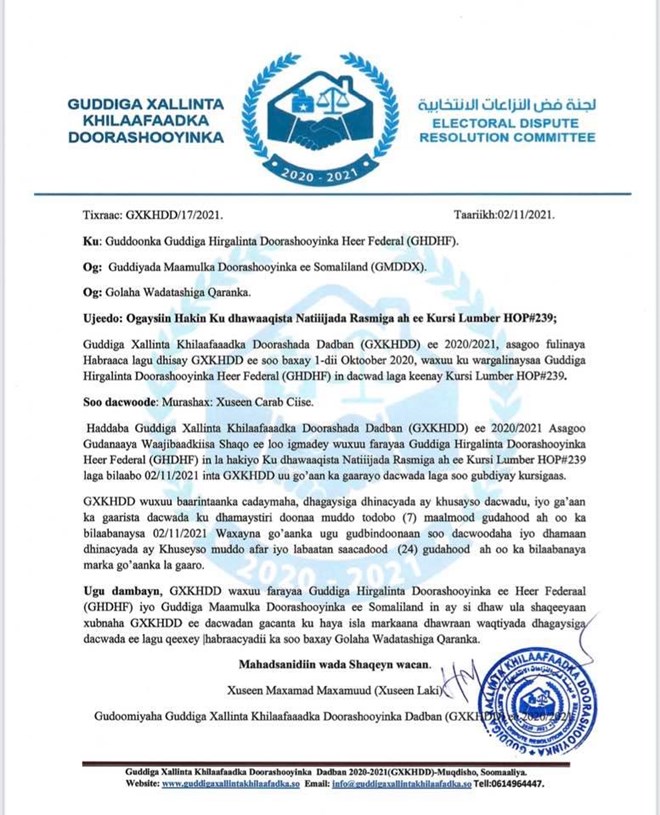 Talaado, November 2, 2021 (HOL) - Guddiga xallinta khilaafaadka doorashada ayaa hakiyay Ku dhawaaqista natiijada kursigii uu ku guulaystay raysal wasaare ku xigeenka, Mahdi Guuleed, sida lagu sheegay war rasmi ah oo kasoo baxay guddiga xallinta khilaafaadka doorashooyinka.