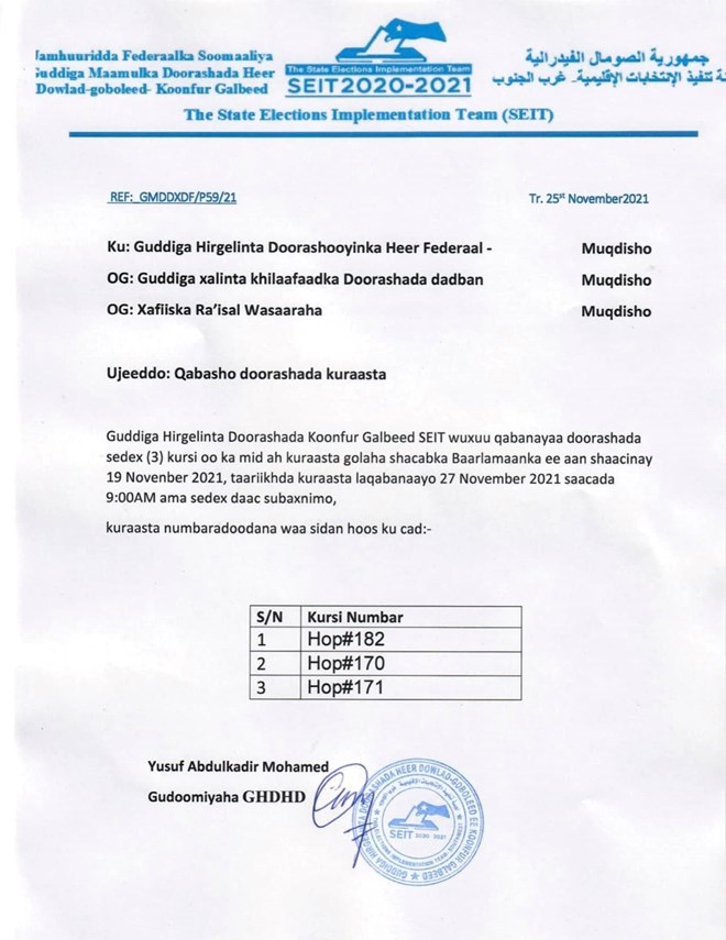 Jimco, November, 26, 2021 (HOL) - Guddiga hirgelinta doorashooyinka maamulka Koonfur Galbeed ayaa ku dhawaaqay qabashada sadax kursi oo ka mid ah kuraasta Golaha Shacabka Baarlamaanka Fedaraalka Soomaaliya ee deegaan doorashadoodu tahay Koonfur Galbeed Soomaaliya.