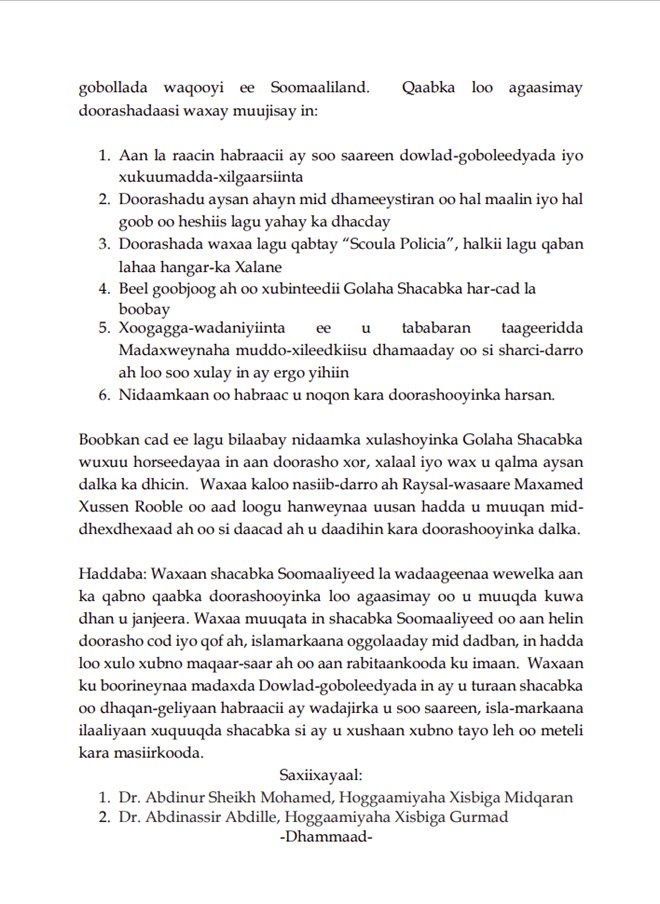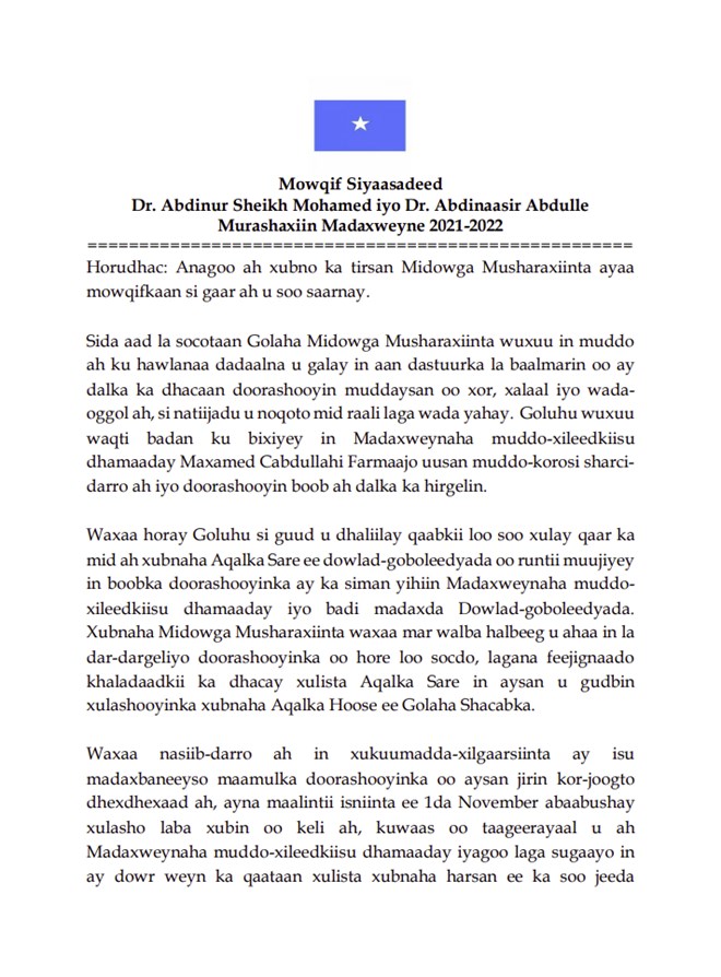 Waxay sidoo kale tilmaameen Musharaxiinta kala ah Dr. Cabdinuur Maxamed iyo Dr. Cabdinasir Cabdulle in raysal wasaaraha Soomaaliya oo loo xushay daadihinta doorasho hufan oo xor iyo xalaal ah inuu ka baxay doorkiisii dhexdhexaadnimo.
