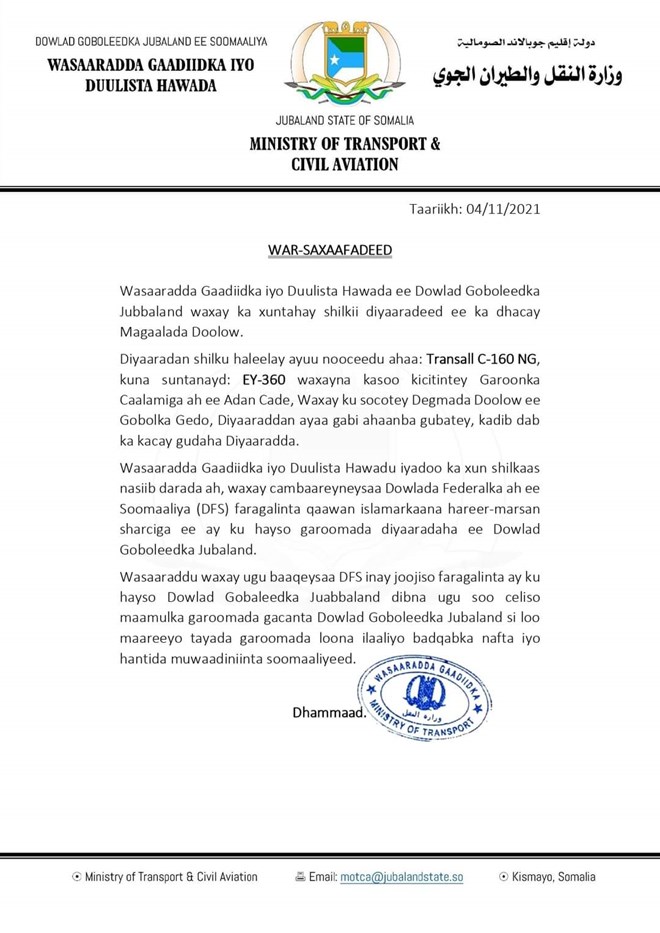 Khamiis, November 4, 2021 (HOL) - Dowlad goboleedka Jubbaland ayaa ku eedeeyay dowladda federalka  in ay sharuuc qaldan ku maamuusho garoomada diyaaradaha ee ku-yaalla gobolka Gedo oo ay dowladda federalku maamusho.