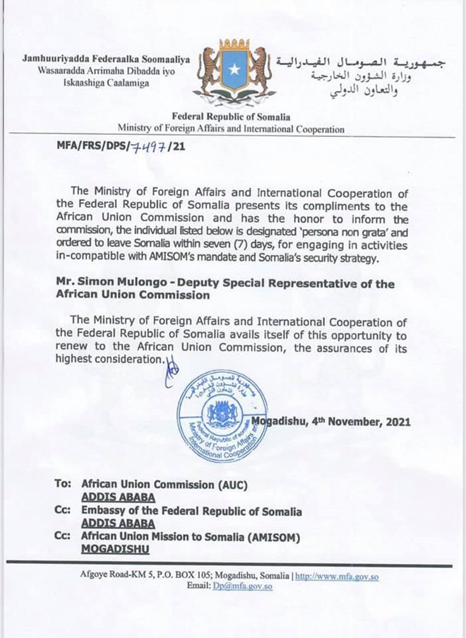 Khamiis, November 4, 2021 (HOL) - Dowladda Soomaaliya ayaa soo saartay amar ku socda ku xigeenka Midowga Afrika ee Soomaaliya ninka lagu magacaabo Simon Mulongo inuu dalka uga baxo muddo 7 cisho ah.