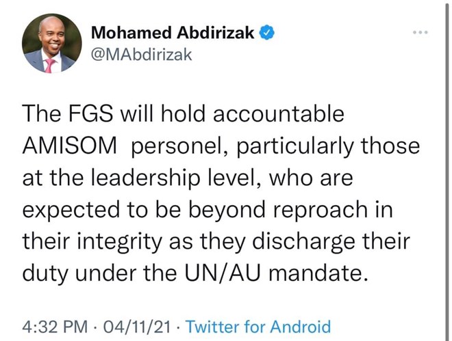 Jimco, November 5, 2021 (HOL) - Wasiirka arrimaha Dibadda, Maxamed Cabdirisaaq Maxamuud, ayaa sheegay in dowladda Soomaaliya ay la xisaabtami doonto saraakiisha AMISOM gaar ahaan kuwa hoggaanka haya.