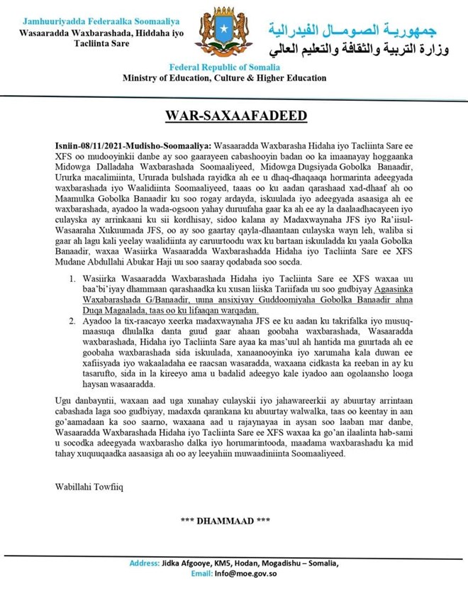 Isniin, November 8, 2021 (HOL) - Wasaaradda Waxbarashadda Hiddaha iyo Tacliinta sare ee dowladda Fedaraalka Soomaaliya ayaa soo saartay go'aano ku aadan cabashooyin uga yimid hay'addaha Waxbarashada gobolka Banaadir.