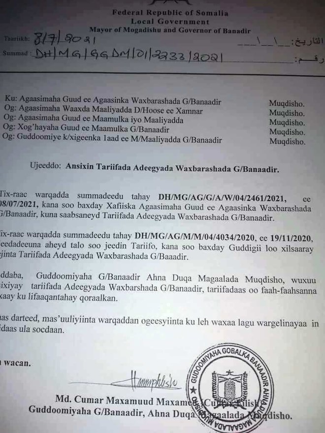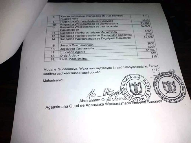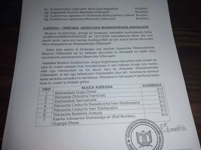 newsinsideWar qoraal ah oo kasoo baxay Xafiiska Wasiirka Wasaaradda Waxbarashada Xukuumadda Soomaaliya Cabdullaahi Abuukar Xaaji ayaa waxaa lagu sheegay in wasaaradda ay baabi'isay dhamaan qarashaadkii ku xusnaa liiska Tariifada ee uu soo gudbiyay Agaasimaha Waxbarashada gobolka Banaadir, islamarkaana uu ansixiyay guddoomiyaha gobolka Banaadir.