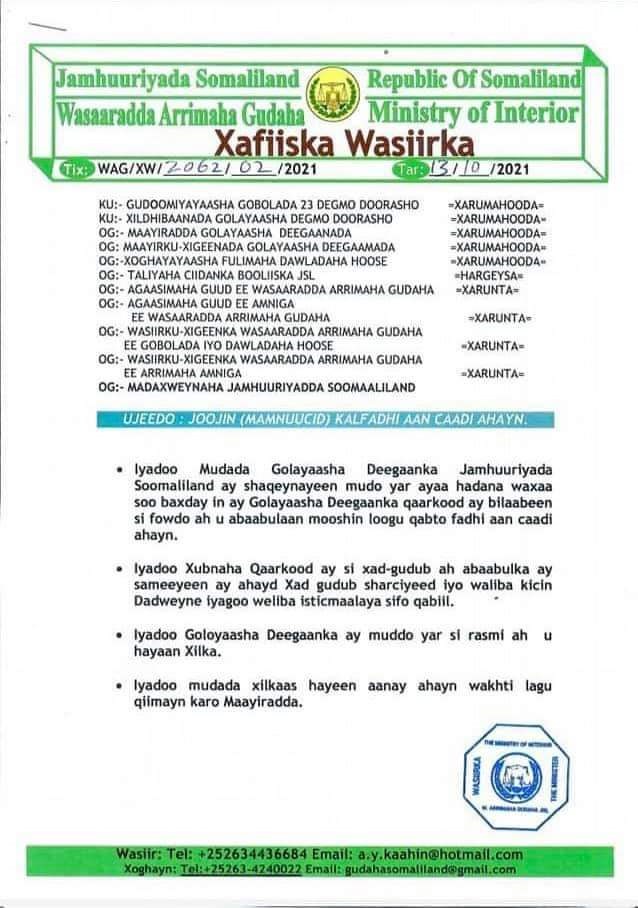 Arbaco, October, 13, 2021 (HOL) - Wasaarada arrimaha gudaha ee Somaliland ayaa hakisay qabashada fadhiyada aan caadiga ahayn ee golayaasha deegaanada Somaliland, waxaana lagu eedeeyay in ay bilaabeen mooshino deg deg ah oo xilalka lagaga qaadayo mayarada.