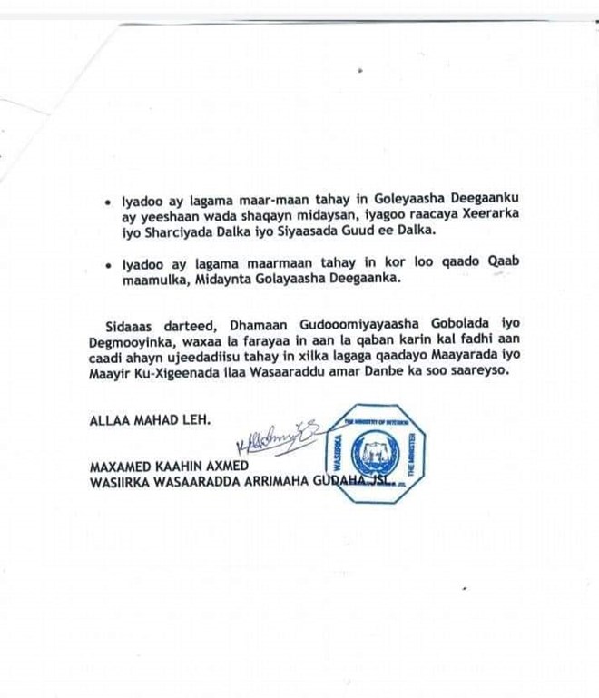newsinside"Iyagoo golayaasha deegaanka ee Somaliland ay shaqaynayeen muddo yar, ayaa hadana waxa soo baxday in galayaasha deegaanka qaarkood ay bilaabeen in ay si fowdo ah u abaabulaan mooshin lagu qabanayo kalfadhi aan caadi ahayn" ayaa lagu yidhi qoraal kasoo baxay wasaarada arrimaha gudaha.