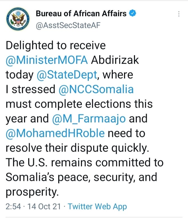 Khamiis, October, 14, 2021 (HOL) - Dowladda Maraykanka ayaa carrabka ku adkaysay in loo baahan yahay in la dhameystiro doorashooyinka Soomaaliya, isla markaana si degdeg ah loo dhameeyo khilaafka Farmaajo iyo Rooble.