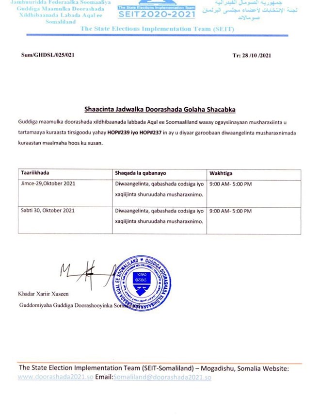 Jimco, October, 29, 2021 (HOL) - Guddiga Hirgelinta doorashooyinka gobolada Waqooyi ee Somaliland ayaa shaaciyay Jadwalka doorashada laba ka mid ah kuraasta Xildhibaanada Golaha Shacabka ee deegaan doorashadooda tahay gobolada Waqooyi.