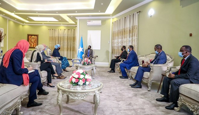 Axad, September, 12, 2021 (HOL) - Madaxweyne Farmaajo ayaa Madaxtooyada ku qaabilay wafdi heer sare ah oo ka tirsan Qaramada Midoobey oo ay hoggaamineysay Ku-xigeenka Xoghayaha Guud ee Qaramada Midoobey Marwo Aamina Jane Maxamed.