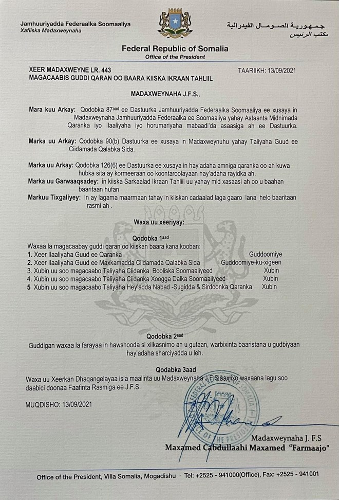 Isniin, September, 13, 2021 (HOL) - Madaxweynaha dowladda Soomaaliya Maxamed Cabdullaahi Farmaajo ayaa magacaabay guddi qaran oo baaritaan ku sameeynaya kiiska Ikraan Tahliil Faarax.
