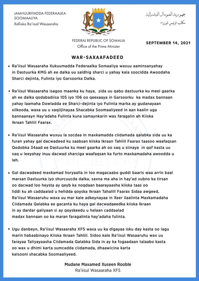 Talaado, September, 14, 2021 (HOL) - Ra’iisul Wasaaraha Soomaaliya Maxamed Xuseen Rooble ayaa war uu caawa soo saaray kaga digay isku day kasta oo lagu marin habaabinayo Kiiska Ikraan Tahliil.