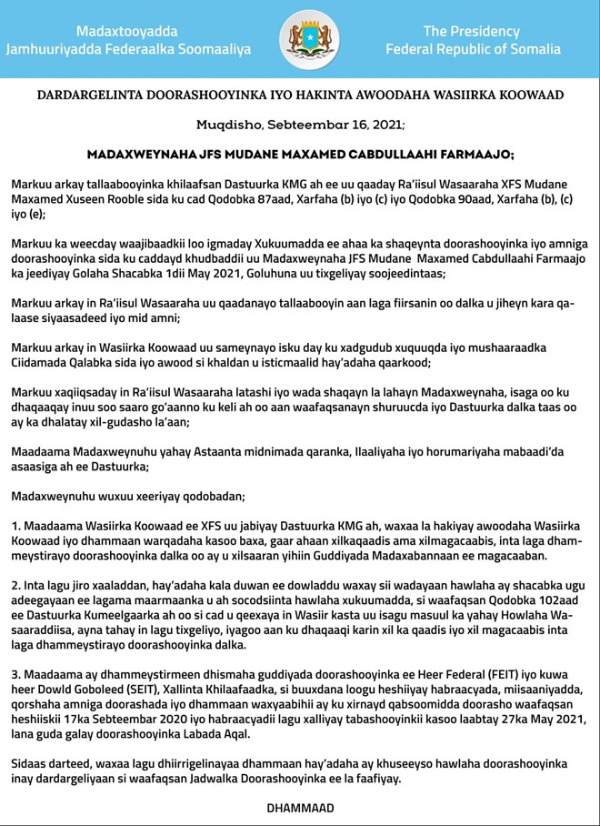 Khamiis, September, 16, 2021 (HOL) - Madaxweyne Farmaajo ayaa soo saaray wareegto uu ku hakinayo awoodaha raysal wasaare Rooble, kadib markii uu ku eedeeyay inuu soo saaro go’aanno ku keli ah oo aan waafaqsanayn shuruucda iyo Dastuurka dalka.
