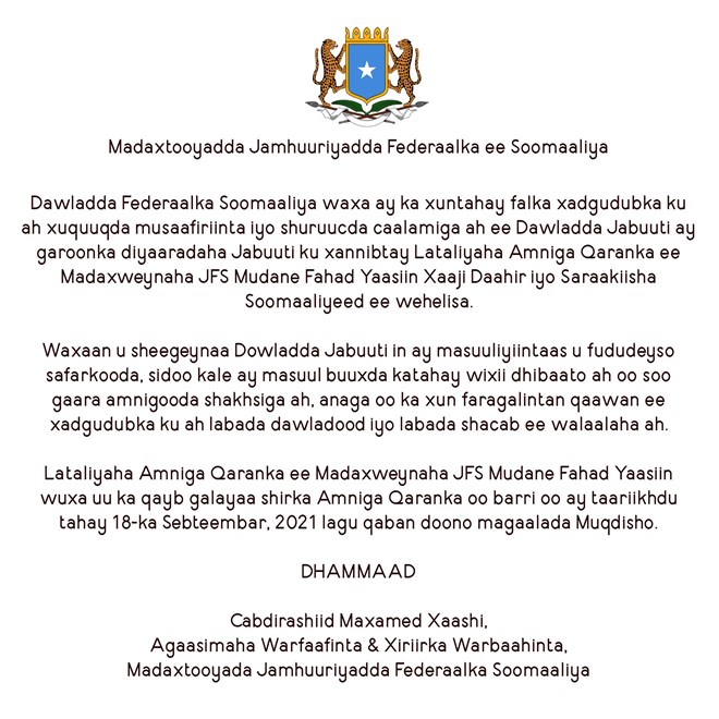 "Dawladda Federaalka Soomaaliya waxay ka xuntahay falka xadgudubka ku ah xuquuqda musaafiriinta iyo shuruucda caalamiga ah ee Dawladda Jabuuti ay garoonka diyaaradaha Jabuuti ku xanibtay Lataliyaha Amniga Qaranka ee Madaxweynaha JFS Mudane Fahad Yaasiin Xaaji Daahir iyo Saraakiisha Soomaaliyeed ee wehlisa" ayuu yri Afhayeenka Madaxtooyada Cabdirashiid Maxamed Xaashi.