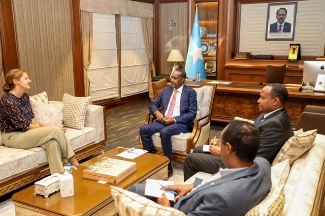 Isniin, September, 20, 2021 (HOL) - Raysal wasaaraha Xukuumadda Fedaraalka Soomaaliya Maxamed Xuseen Rooble ayaa maanta xafiiskiisa ku qaabilay Danjiraha dalka UK u jooga Soomaaliya Kate Foster.